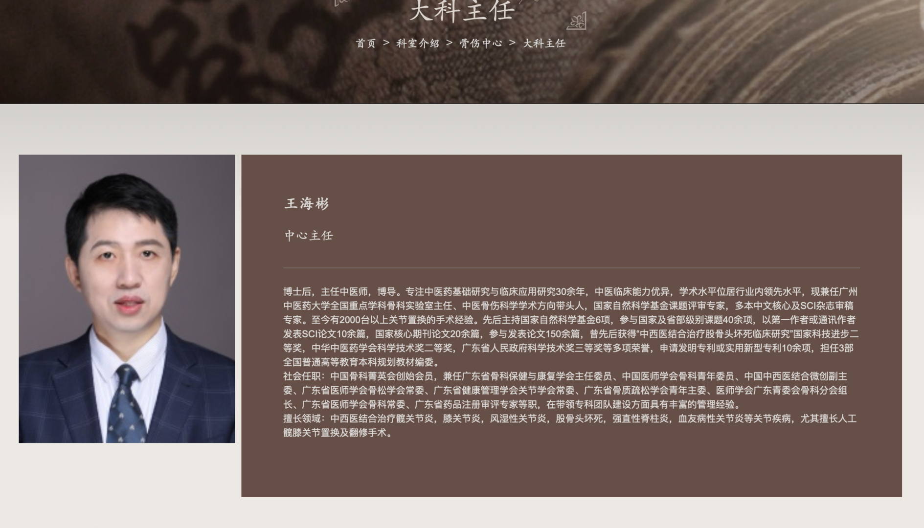 医院官网显示,王海彬,男,1971年4月出生于山东,博士,博士后,博导,为该院骨科主任中医师。专注中医药基础研究与临床应用研究30余年,现兼任广州中医药大学全国重点学科骨科实验室主任、中医骨伤科学学术方向带头人,国家自然科学基金课题评审专家,多本中文核心及SCI杂志审稿专家。至今有2000台以上关节置换的手术经验。