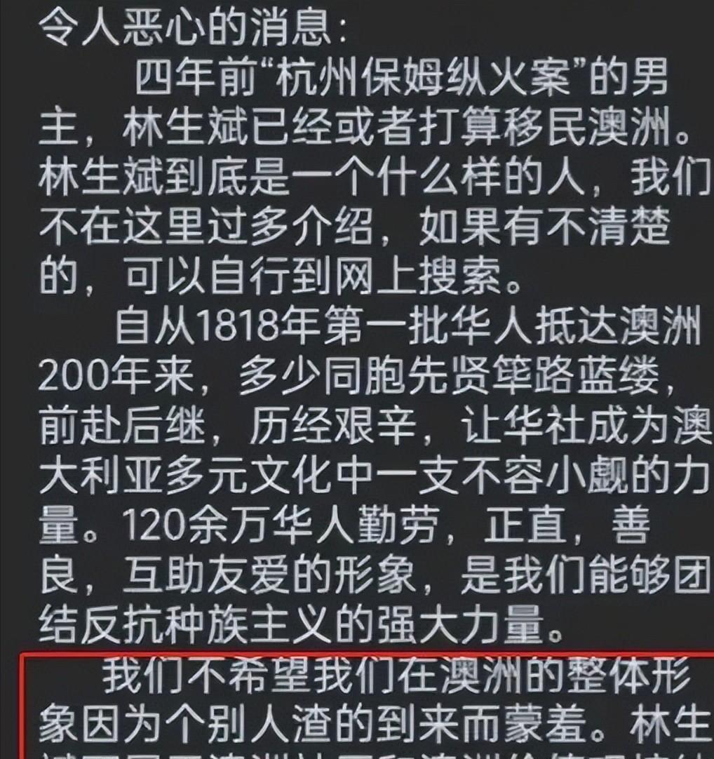 他们觉得华人在澳洲一直以来都是正直善良的形象,绝不能忍受林生斌这样的人来到这里。