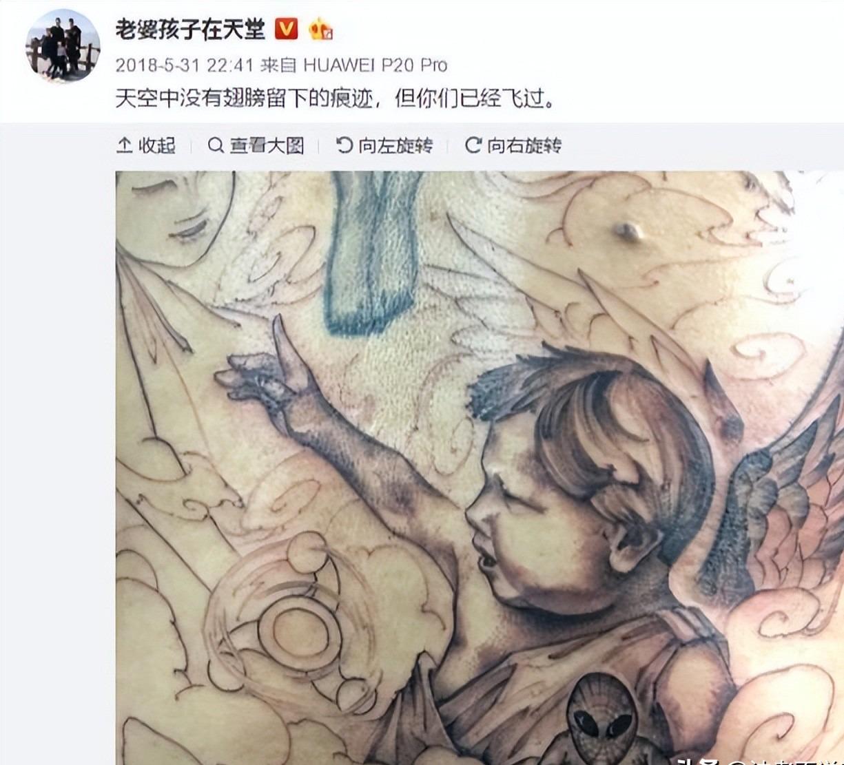 他还将妻子和三个孩子的形象,以天使的模样纹在了自己的背上。